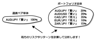 自分が保有している、通貨ペアの単体のリスクはもちろんのこと、複数の通貨ペアを保有した場合などのポートフォリオ全体のリスク計算を、ボタン1つで簡単に分析します。