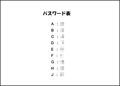 DVD購入の教材『セミナー資料』PDFファイルの最終ベージに「パスワード表」があります。